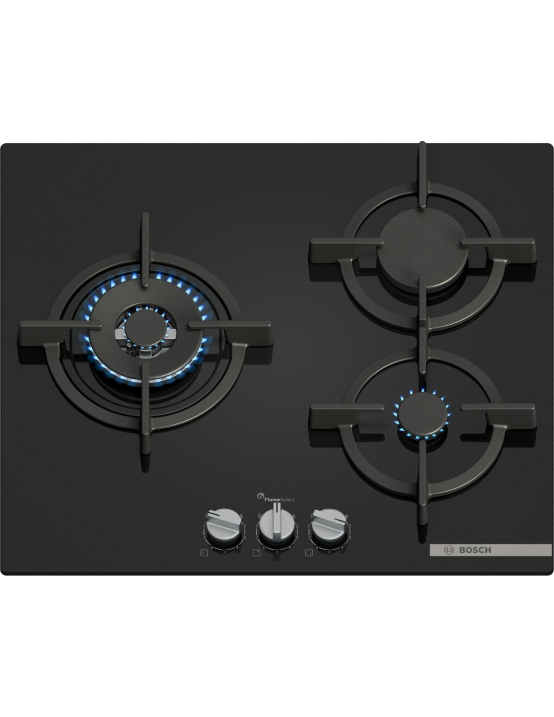 PPC6A6I10, Encimera, Gas, Encastrable, 60cm., 3 fuegos, Cristal templado negro, FlameSelect, wok 4 kW., gasStop, parrillas hierro fundido aptas lavavajillas, autoencendido.