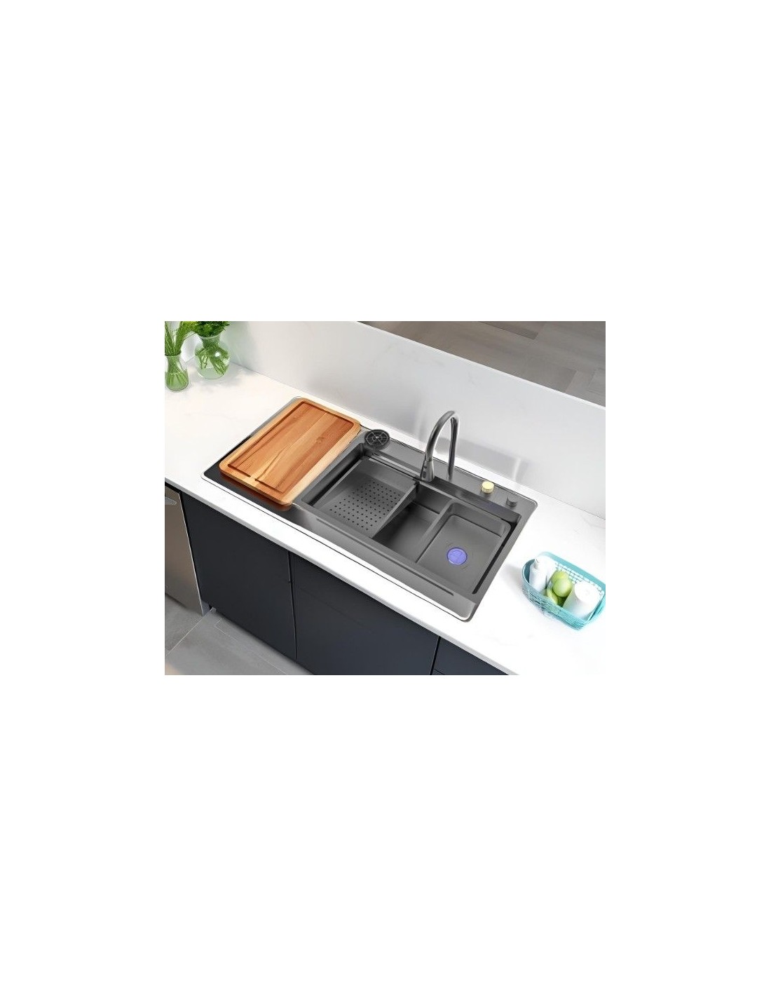 Cubeta cuadrada/ Instalación en mueble de 80cm/ Dimensiones: 75 x 45 cm/ Profundidad de la cubeta 20cm/ Cortina cascada/ Grifo, lavavasos, dispensador de jabón, tabla de corte y escurridor multifunción incluidos/ Acero inoxidable AISI 304 18/ 8/