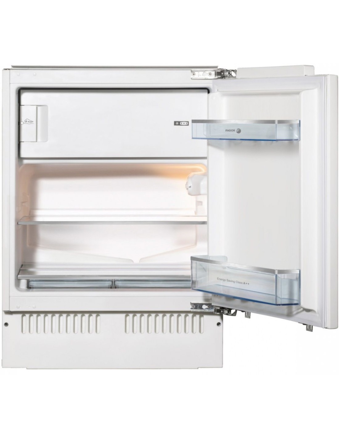 Frigorifico 1P Fagor 3FIS844, Integración | Sistema de Bisagras Fijas | Termostato Mecánico | Compartimento Congelador 3* de 16 Litros |2 Cajones Verduleros | Iluminación LED Lateral | Volumen total: 111 Litros | Puertas Reversibles | Clasificación energética: E